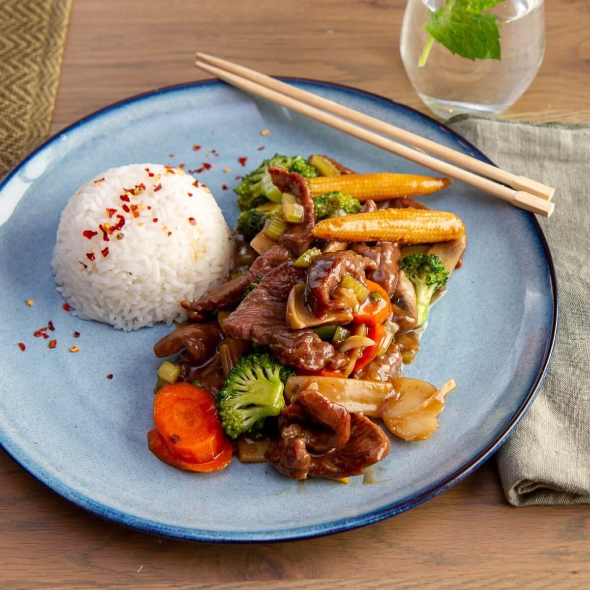 Saftige biffstrimler woket med grønnsaker og servert med ris.